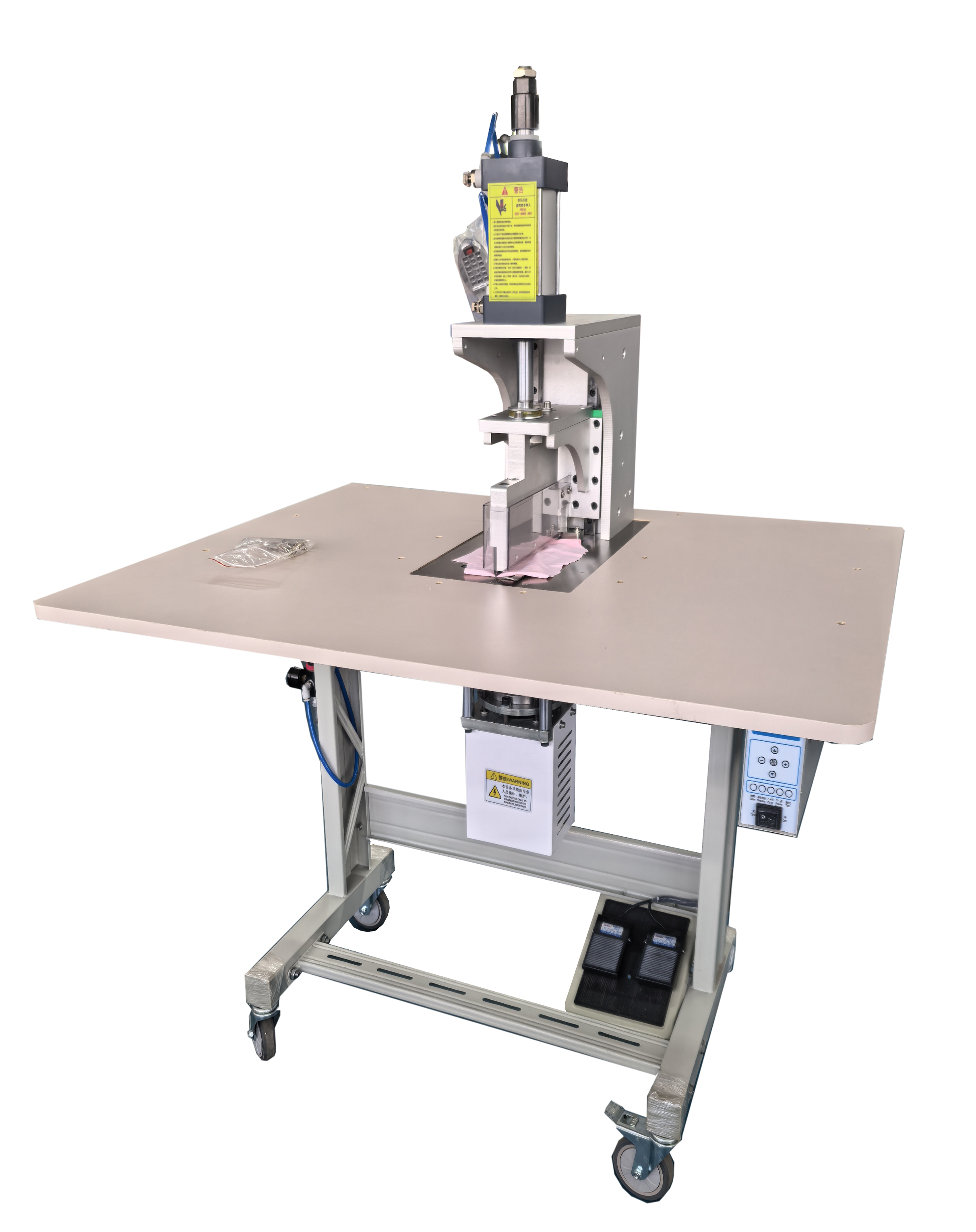 一种适用于无缝门襟工艺设备。主要用于合成纤维布料的无缝门襟熔接。本机拥有多项新型的设计实用专利,改进电子电路工艺技术,利于提高工作效率和延长焊头、花轮的使用寿命同时也方便工人生产产品时的对位、观察、调机等